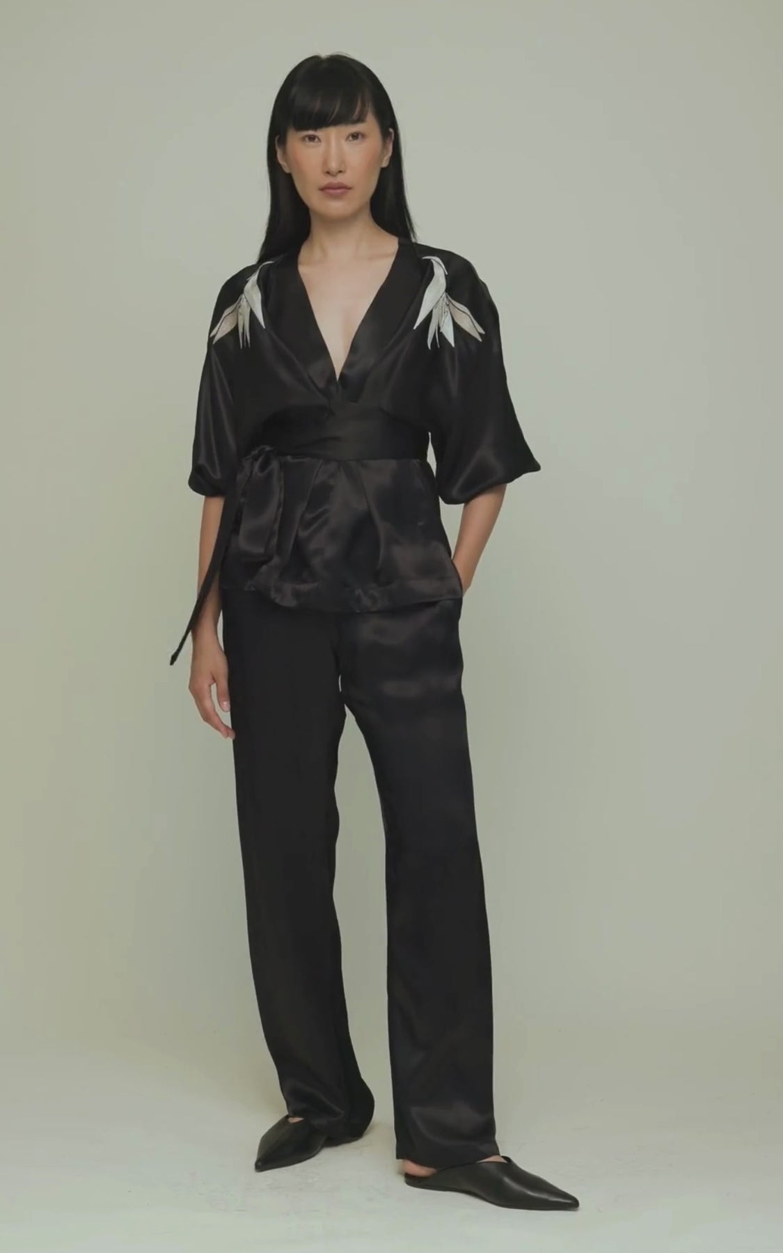 A new fabric for Tallulah & Hope, Royal Satin Crepe was chosen for its rich handle, fluid drape, and liquid lustre in deep jet black.