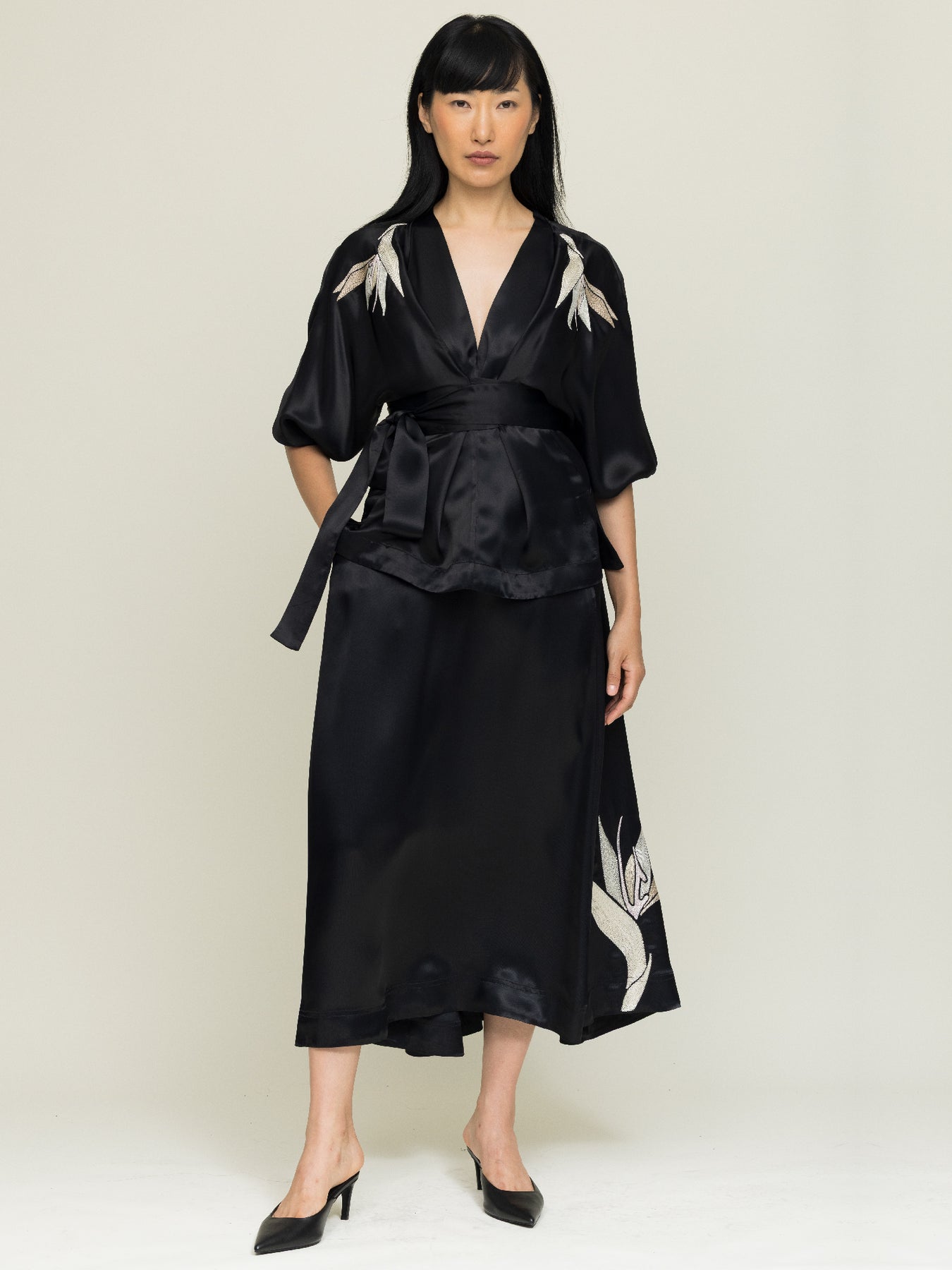 Isabel Wrap Blouse Royal Satin Crepe Jet Black