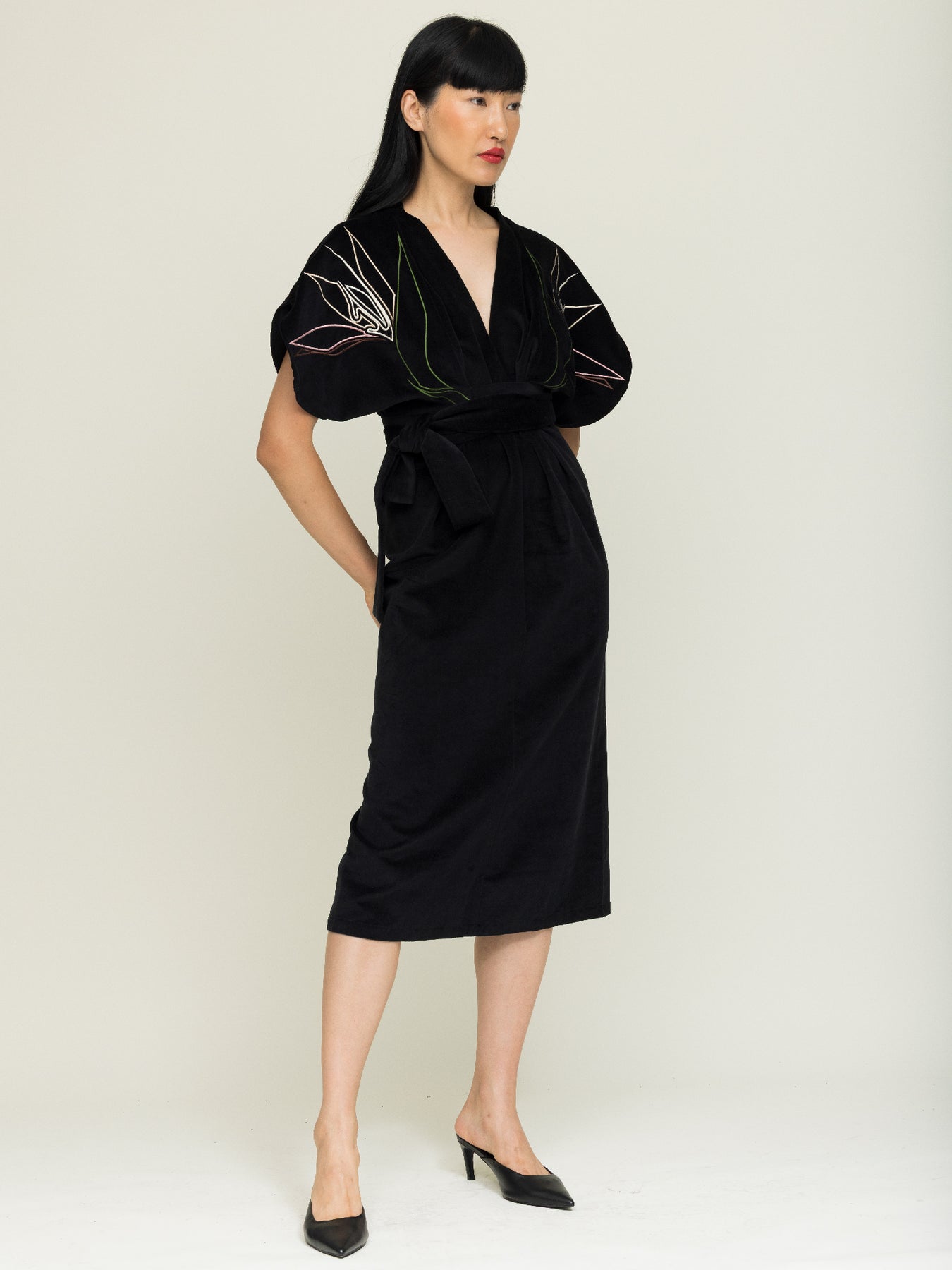 The Miller Dress reimagines the classic black dress with bold creativity, confidence, and originality. Cut from 100% premium cotton velvet, it combines our signature cocoon wrap silhouette with dramatic design details that make it a true statement piece.