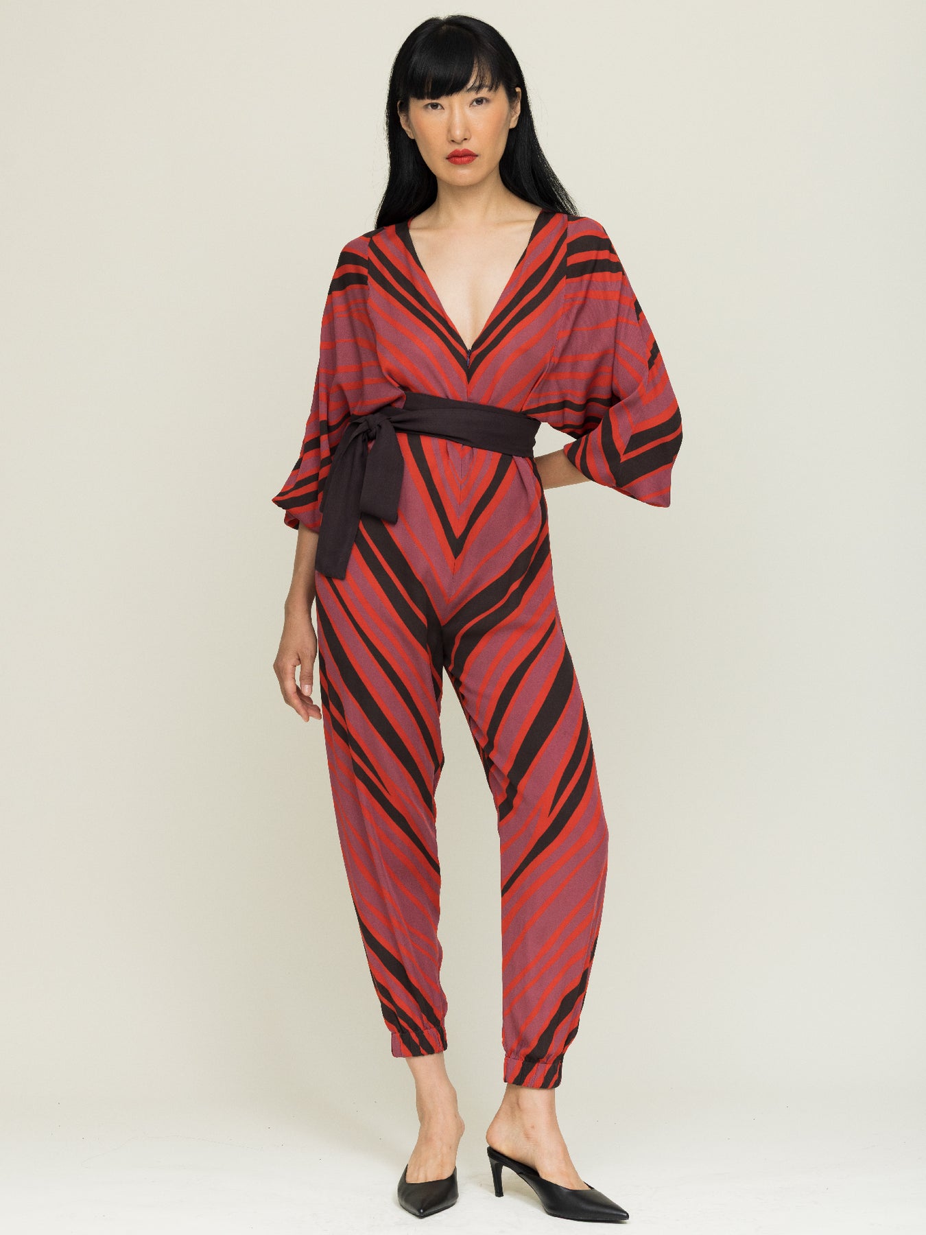 Our signature wrap jumpsuit returns in an art-inspired Copal print, featuring organic linear dynamics in vibrant crimson, crushed raspberry, and black. Designed for effortless elegance and ease, the fit has been refined to create a silhouette that moves beautifully with you.