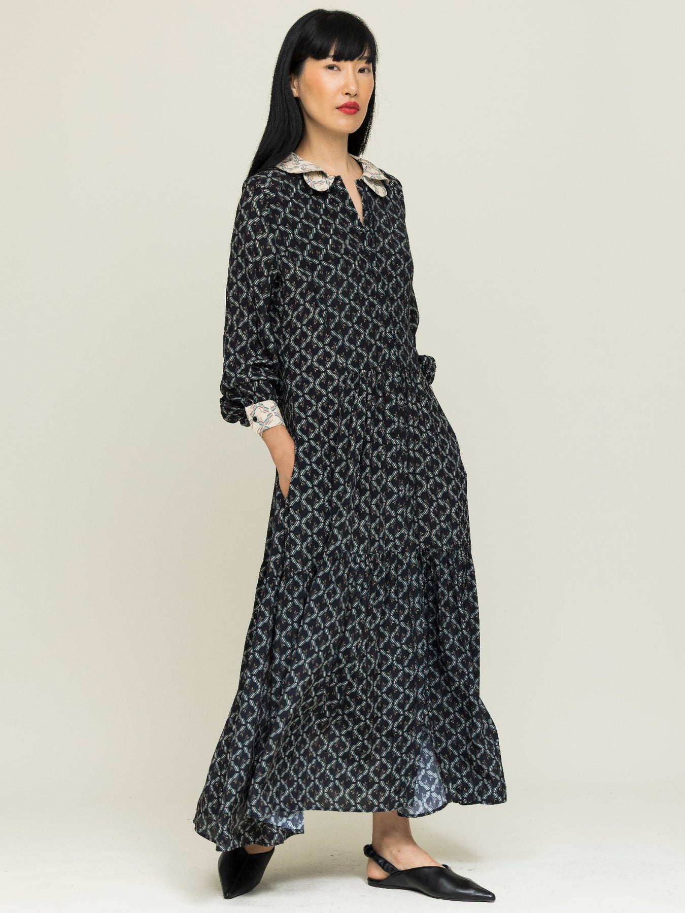 The Asta tiered shirt dress features a beautiful, soft petal collar and wide cuffs with button in a contrast print colourway for a refined finish. Made in a premium viscose crepe the flattering, fluid silhouette is enhanced by a unique digitally printed graphic print.