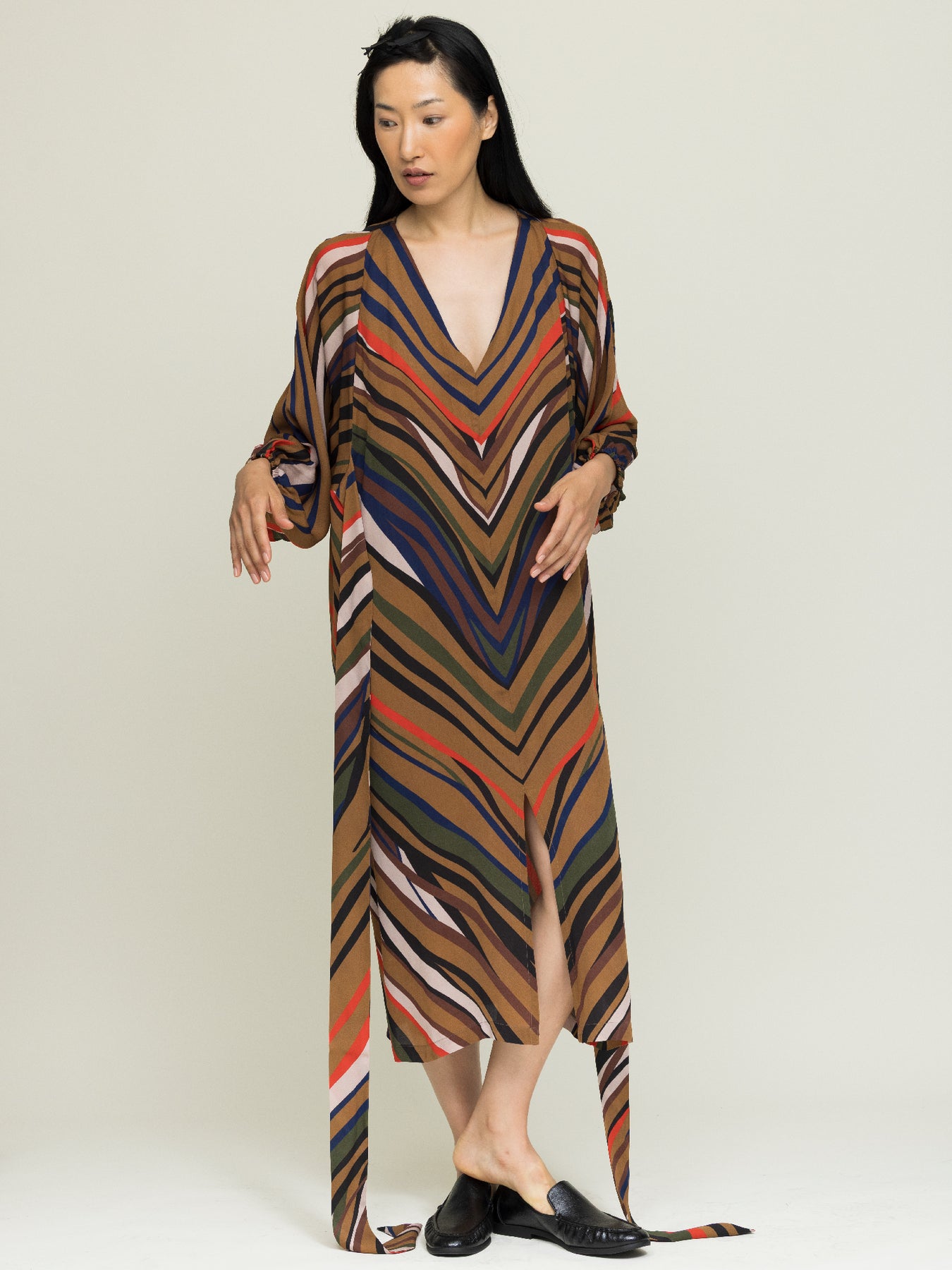 Kimono-inspired in its design, the dress features our signature wrap silhouette, cinched at the waist with long ties for a flattering fit. Elasticated cuffs allow the voluminous sleeves to be worn long or pushed up to the elbow, creating a soft, flowing curve.