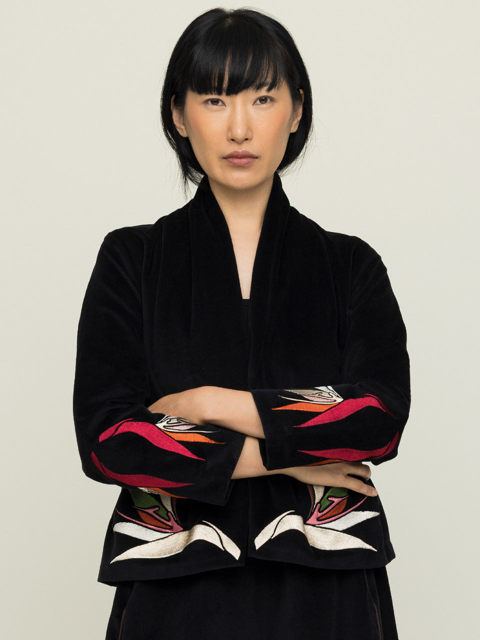 A premium natural velvet with depth and sheen, enhanced with artisan embroidery.
