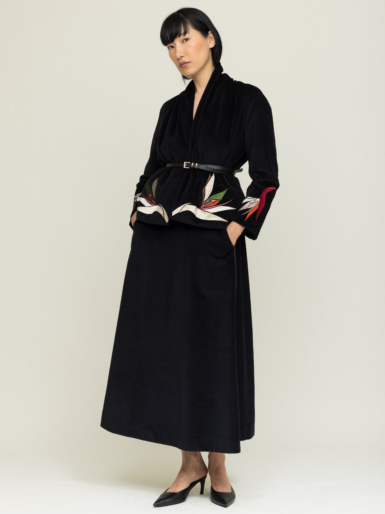 Exquisite original embroidery elevates the piece: fiery reds and pinks run across the cuffs, with softer neutrals and pops of colour at the hemline.